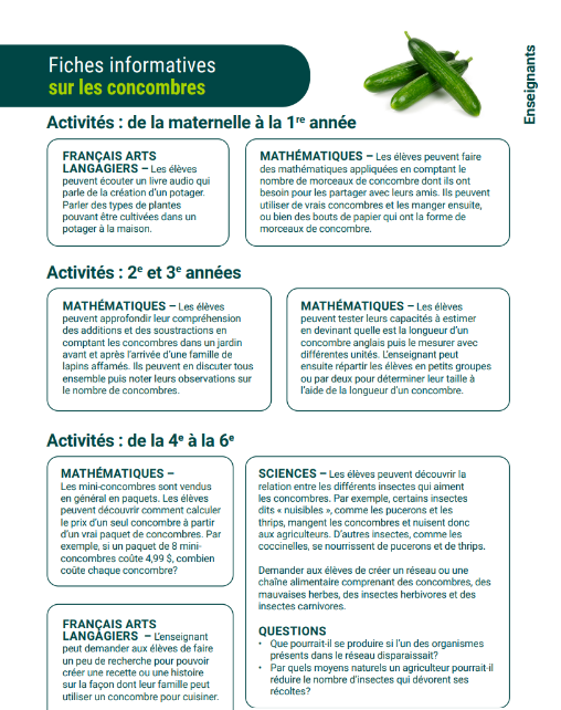 Explorez nos ressources sur les collations de la ferme à l’école concernant les concombres ici.