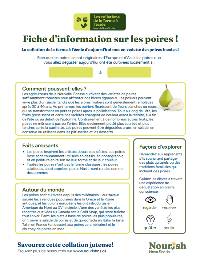 Explorez nos ressources sur les collations de la ferme à l’école concernant les poires ici.