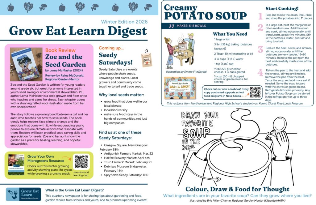 This quarterly newspaper was created by the Grow Eat Learn team to share garden stories from the schools and youth we work with, information and tips about gardening and growing food, as well as to highlight upcoming events and programming related to school and community gardens across Mi’kma’ki (NS).